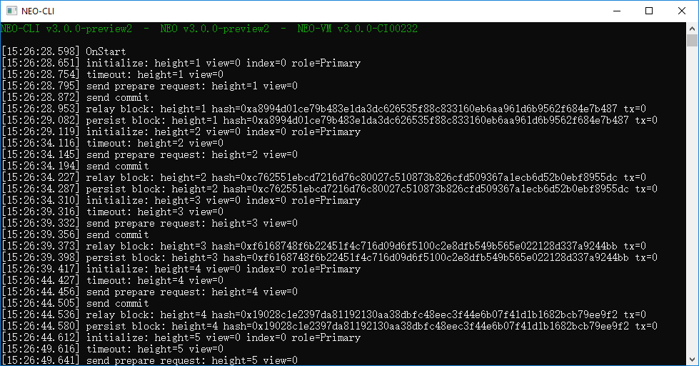 进入 neo-cli 目录,双击 neo-cli.exe 或打开 cmd 并运行dotnet neo-cli.dll即可启动私链。成功建立的私链如下图所示。